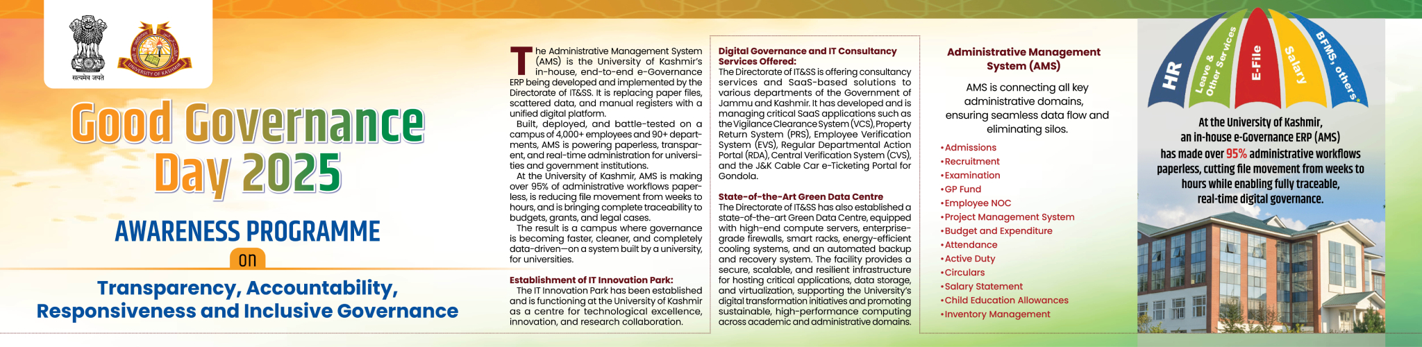 The University of Jammu and Kashmir was founded in the year 1948. In the year 1969 it was bifurcated into two full-fledged Universities: University of Kashmir at Srinagar and University of Jammu at Jammu. The University of Kashmir is situated at Hazratbal in Srinagar. It is flanked by the world famous Dal Lake on its eastern side and Nigeen Lake on the western side. The Main Campus of the University spread over 247 acres of